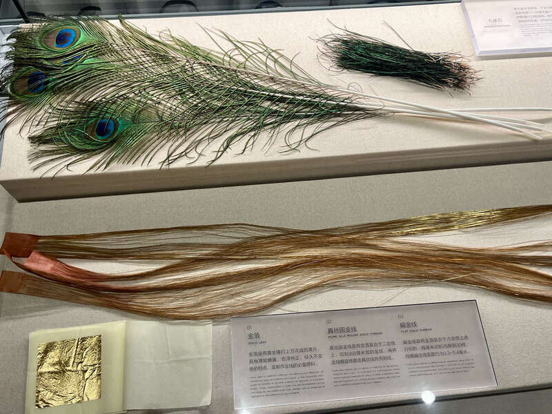 由于在织物中加入金线,需将一块块指甲盖大小金块,经8小时近3万次捶打成薄如蝉翼金箔,再进行切割,每根扁金线宽度约为0.3-0.4毫米,比头发丝还细小;工匠每天仅织10厘米,整整两个月才织就“雀金裘”所需的6米华锦面料。