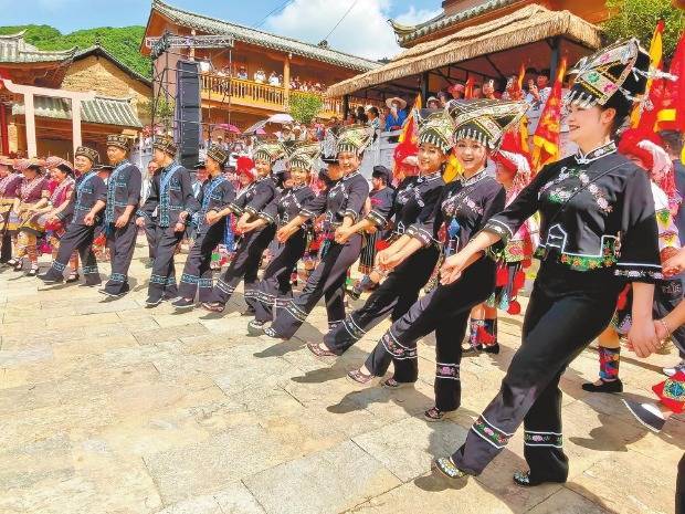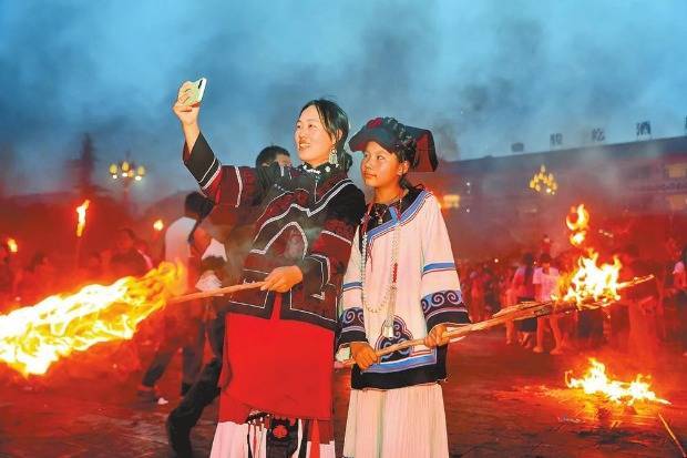 r7月17日,在蒙自市观澜街道十里铺村举行的第二届彝族火把节现场,迎宾仪式、火把宴、点火狂欢等活动全方位展现了彝族火文化的千年底蕴与现代活力,吸引数万名游客共赴盛夏狂欢。火把节期间,蒙自市尼苏小镇、永宁村、冷泉镇等地还将举行双鞭舞、龙狮腾欢、三步弦舞蹈赛等活动,让远道而来的游客感受浓浓的民俗风情。