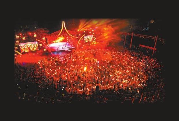 r开幕式现场,鼓号、细乐、过山号、管乐、大三弦等文艺代表队轮番献艺,为游客市民带来一场文化盛宴。在随后的点火仪式中,5名毕摩吟诵祭词,祈福民族团结、瑞降石林、福祉万世。主题晚会上,《天唱·夏之祭》《云秀·民族魂》《火种·夜未央》3个篇章13个节目将当晚的氛围推向了高潮。