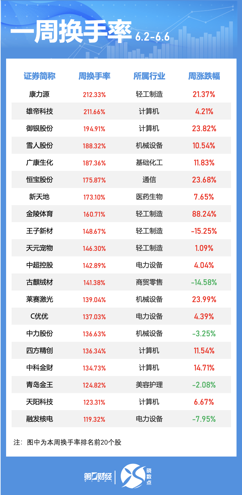 本周五个交易日中仅有29只个股换手率超过100%。其中,康力源排名居首,周换手率达到212.33%;此外,雄帝科技本周换手率也超200%。