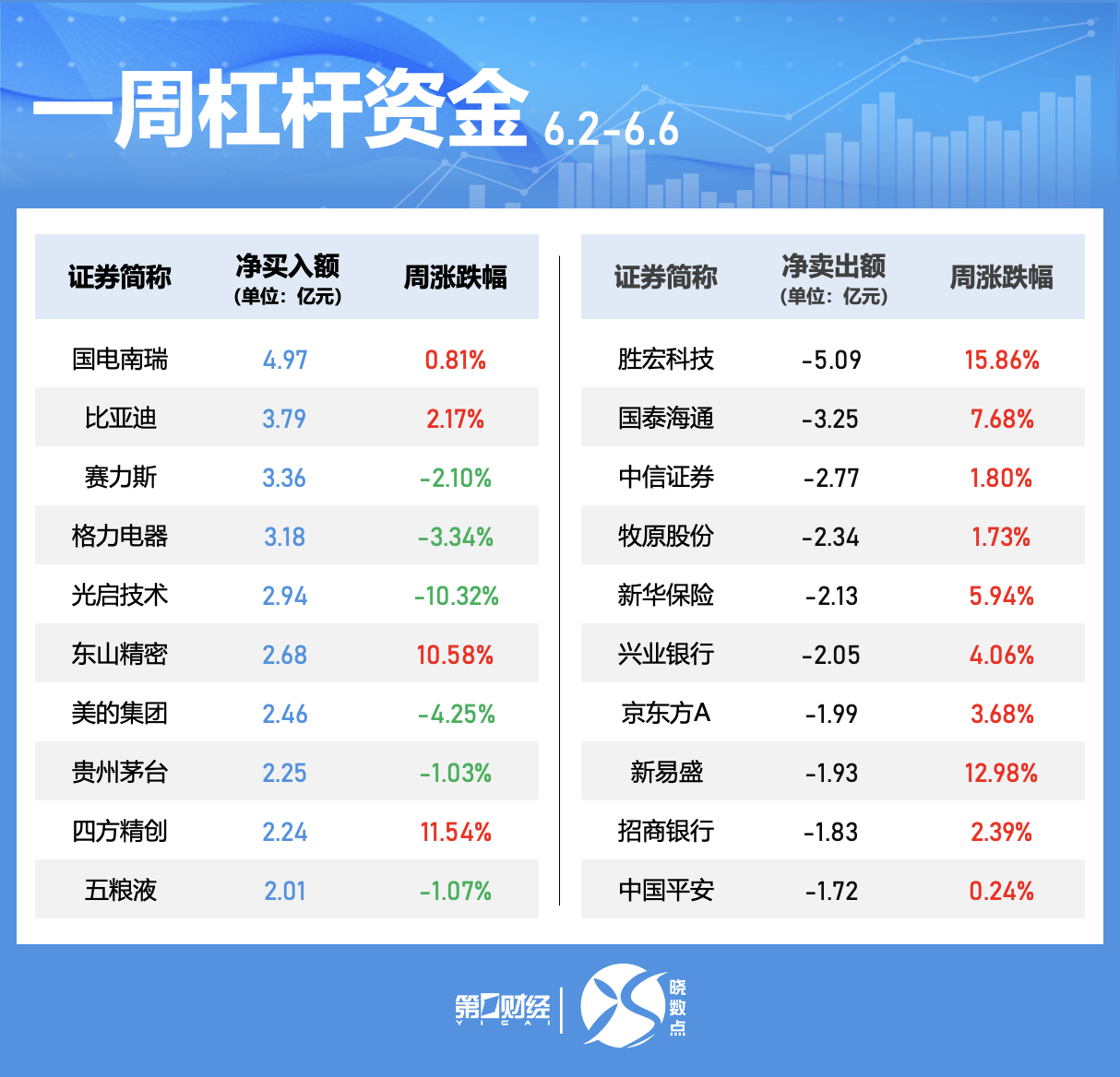 国电南瑞本周获融资净买入居首,净买入额为4.97 亿元。比亚迪、赛力斯、格力电器净买入居前,金额分别为3.79亿元、3.36亿元、3.18亿元;胜宏科技、国泰海通、中信证券遭净卖出额居前,金额分别为5.09 亿元、3.25亿元、2.77亿元。