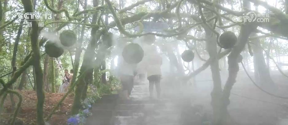 在湖北南漳野生动物园里,水雾从林间漫出,动物园巧妙利用园区内丰富的森林和水系资源精心打造了一片绿树成荫、水雾弥漫的清凉秘境。游客穿行其间,不仅能沉浸式体验梦幻的森林之旅,感受“天然空调”带来的沁人凉意,还能漫步水中捞鱼。
