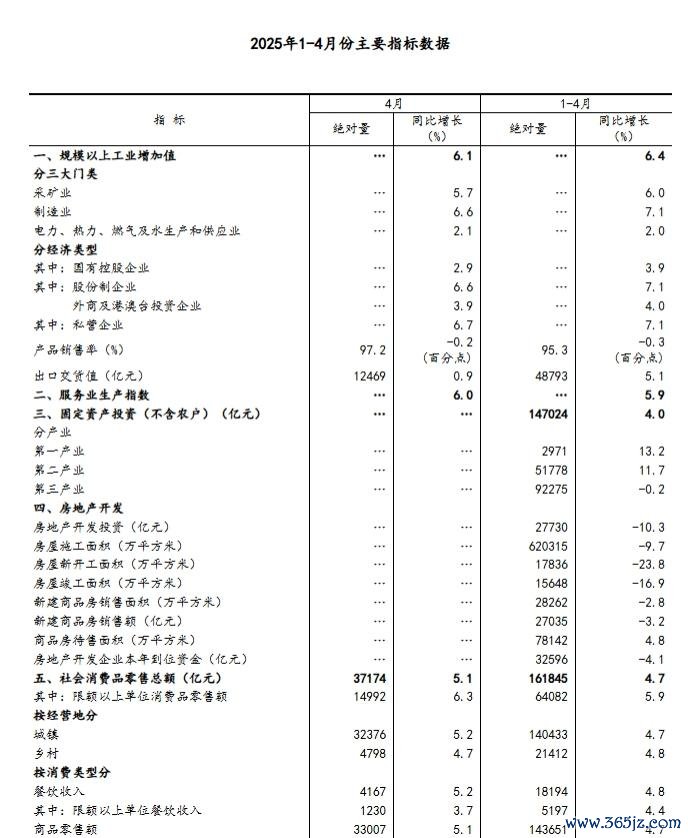 4月份,社会消费品零售总额37174亿元,同比增长5.1%;环比增长0.24%。按经营单位所在地分,城镇消费品零售额32376亿元,同比增长5.2%;乡村消费品零售额4798亿元,增长4.7%。按消费类型分,商品零售额33007亿元,增长5.1%;餐饮收入4167亿元,增长5.2%。基本生活类和部分升级类商品销售增势较好,限额以上单位粮油食品类、体育娱乐用品类商品零售额分别增长14.0%、23.3%。消费品以旧换新政策持续显效,限额以上单位家用电器和音像器材类、文化办公用品类、家具类、通讯器材类商品零售额分别增长38.8%、33.5%、26.9%、19.9%。1-4月份,社会消费品零售总额161845亿元,同比增长4.7%。全国网上零售额47419亿元,同比增长7.7%。其中,实物商品网上零售额39265亿元,增长5.8%,占社会消费品零售总额的比重为24.3%。1-4月份,服务零售额同比增长5.1%。